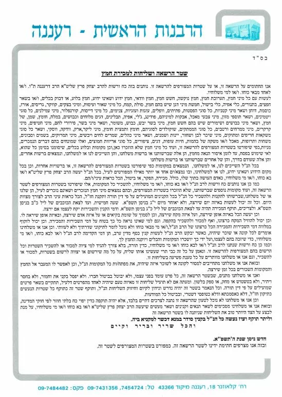 מי שמכרו חמץ באתר זה, ייפו את כוחו של הרב יצחק פרץ שליט"א, רב העיר רעננה ו/או באי כוחו, להיות שלוחי למכור את כל החמץ אשר ברשותם, וכן את החמץ שיבוא לרשותם עד יום ששי י"ג ניסן תשפ"א ( 26.3.21) בשעה 08:30, כמפורט בשטר דלעיל.