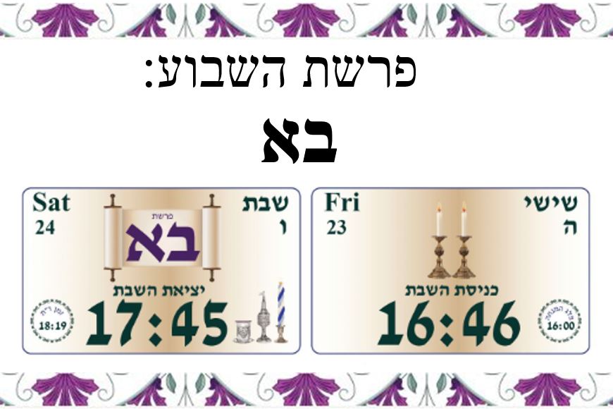 זמני כניסת שבת פרשת בשלח כניסת שבת 16:52 יציאת שבת 17:51 חדשות ועדכונים נישואין כשרות מקוואות תרבות תורנית בתי כנסת עירוב, גניזה וגמ"ח קובץ להדפסה: תפילה לשלום המדינה, תפילה לשלום חיילי צה"ל וכוחות הביטחון קובץ להדפסה: תפילה לשלום החטופים ופרקי תהילים שאל את הרב Ask The Rav לרכישה לחץ כאן
