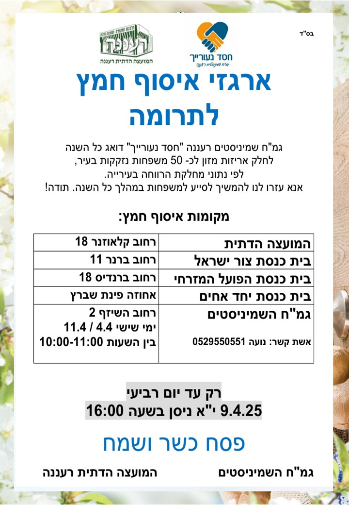 גם השנה העזרה לנזקקים רבה. המועצה הדתית משתתפת כמדי שנה בקמחא דפסחא של קרן קהילות רעננה, בתי חב"ד ומחלקת הרווחה בעירייה, במימון ליל הסדר וחבילות לנזקקים.