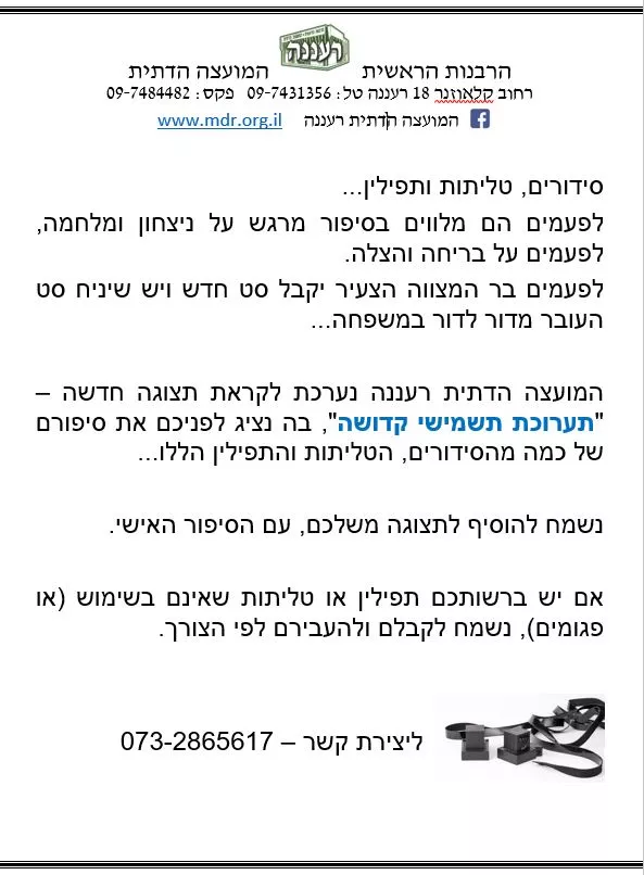 המועצה הדתית רעננה נערכת לקראת תצוגה חדשה – "תערוכת תשמישי קדושה", בה נציג לפניכם את סיפורם של כמה מהסידורים, הטליתות והתפילין הללו…