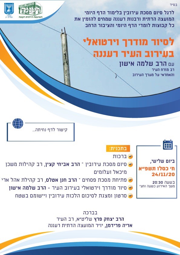 ראשי » חדשות ועדכונים » 24.11.2020 סיום מסכת עירובין וסיור וירטואלי בעירוב של רעננה 24.11.2020 סיום מסכת עירובין וסיור וירטואלי בעירוב של רעננה הקלטת האירוע ב Youtube של המועצה הדתית רעננה להצטרפות ב Youtube של המועצה הדתית רעננה בפייסבוק של המועצה הדתית רעננה להצטרפות בפייסבוק של המועצה הדתית רעננה 24.11.2020 20:30 סיום מסכת עירובין וסיור וירטואלי בעירוב של רעננה לרגל סיום מסכת עירובין בלימוד הדף היומי, המועצה הדתית ורבנות רעננה שמחים להזמין את כל קבוצות לומדי הדף היומי והציבור הרחב לסיור מודרך וירטואלי בעירוב העיר רעננה.יום שלישי, ח' כסלו תשפ"א 24.11.20, בשעה 20:30 « הקודםהבא »